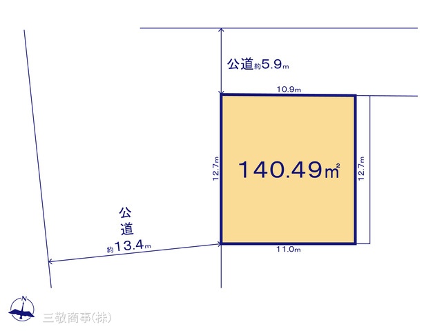 | 現況/引渡し | 更地/相談 | 接道状況 | 接道: 西 13.4m 公道 接道: 北 5.9m 公道 |